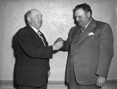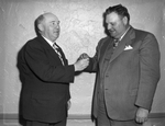 Paul Colvert of Wichita Falls, president of the then recently organized Texas-Oklahoma Hereford Association, is shown on the left, shaking hands with the association's vice president, R. E. Payne of Waurika, Oklahoma. The two are shown at a membership meeting of the association, held in Wichita Falls. Published in the morning edition, April 20, 1950.