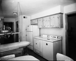 The picture shows an ideal arrangement of tabletop automatic washer and dryer in the kitchen of the new home of Mr. and Mrs. R. J. Carlson, 4820 Lowell Lane. There are wheat colored cabinets above refrigerator and laundry units.