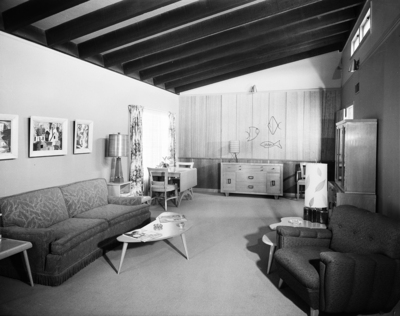 Here is a sample of how contemporary architecture lends itself to furnishings for living-dining combinations. It is in the new home of Mr. and Mrs. R. J. Carlson, 4820 Lowell Lane. Features are limed oak furniture, massive wood beamed ceilings, mixing of mahogany panels and textone for walls, carpeted floors. Russet beige, tans and greens are the colors.