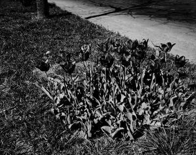 This mass of blossoming tulips is one of many gorgeous spots of color the bulbs have furnished on a tulip trail extending along Meadowbrook and Handley Drives, and North to include Oakland Boulevard and Martel Street. This planting is at the Bert Barnes residence, 1756 Oakland Boulevard.