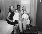Jim Baxes, Cat infielder, gathers his family about him after arrival in Fort Worth Sunday. Left to right are Mrs. Baxes, Brook, 1, Jim, Jimmy, 8, and Cathy, 5, Baxes left the Cat camp in Florida early so that he could collect his family in Los Angeles and be here in time to meet the rest of the Cats when they fly here Wednesday.