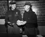 Motorcycle officers D. A. Bridges, left, and his partner C. H. Redmond, display the money taken from the Tivoli Theater Sunday night and the 32 automatic used in the holdup. The two officers arrested two men with the gun and money 30 minutes after the theater box office was robbed.