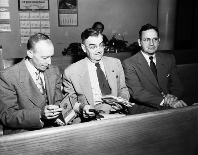 Three federal prison experts visited Commissioners Court Monday and conducted an inspection of the county jail to point needed improvements. Left to right are Captain Robert Moseley of the federal correction institution at seagoville; Roy Casey, former prison inspector in the area and now in charge of federal prisons in Alaska, and Hubert Raney of El Reno, Oklahoma, federal prison inspector for a six-state area.
