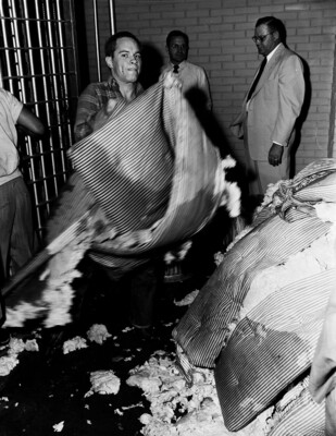 Roy Bayless, 20-year-old county prisoner, tosses a water soaked mattresses into an ash can Tuesday night as he helps clean up damage done by prisoners on the fifth floor. In background Hubert Raney, federal prison inspector, left, and Sherriff Harlon Wright, right, oversee the work.