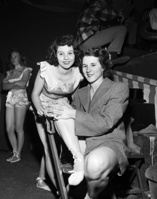 Two Fort Worth girls, Ruth Price, left, and Virginia Elliott star in the Gainesville Community Circus which was presented at Fort Worth through Saturday nights for Convair families only. Published in the Fort Worth Star-Telegram morning edition, April 27, 1950.