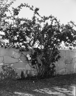 This 4-year-old Peace climbing rose, which runs on a trelis on a rock wall at the C. D. Gordon residence, 2930 South Adams, is a mass of glorious blossoms this spring. When this picture was made there were more than 180 blooms, some of them measuring as much as six inches across and three inches deep.