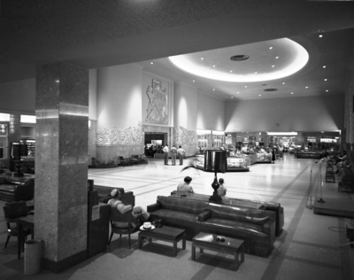Lobby of Greater Fort Worth International Airport showing gold-leaf mural on wall, 04/1953