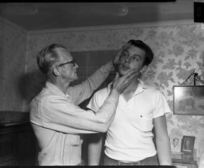 Carl Beauchamp, left, looks at the bruised eye of his son, Charles, 15. The youth was struck Tuesday by Assistant Principal H. A. Wilson at North Side High School.