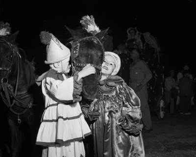 Two performers in the Gainsville Community Circus, Ronnie Davenport, left, and D. D. Ward, talk things over with one of the show's ponies. The circus was presented at Fort Worth through Saturday nights for Convair people. Published in the Fort Worth Star-Telegram evening edition, April 26, 1950.