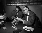 John H. Weare, right, superintendent, and Carl Caruthers, assistant superintendent, of Fort Worth's division of Armour Laboratories, examine small bottles of gamma globulin, anti-polio blood fraction, ready for shipment to Army and civil defense distribution centers.