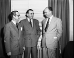 R. G. (Dick) Hughes of Pampa, first Vice President of the National Association of Home Builders, center, conferred here Wednesday with Fort Worth builders. At left is Charles E. Armstrong, architect-coordinator of the Fort Worth Parade of Homes, and at right, R. B. Billings, president of the local association.