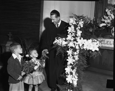 Preparing for the annual floral cross service to be held at 10:45 A. M. Sunday in Saint Paul Lutheran Church are Reveron Walter E. Dorre, pastor, and left to right, Lewell Thronson, 6, son of Mr. and Mrs. Lee Thronson, 4708 Winthrop East, and Julie Kay Clifton, 4, daughter of Mr. and Mrs. Jesse Clifton Jr., of 3928 Earl Street.