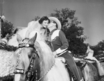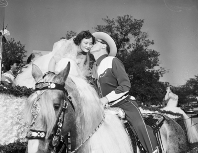Glenn McCarthy planted a firm kiss on Queen Rison's cheek. Gainesville, Texas celebrating the town's 100th birthday. Glenn rides a horse while giving a kiss on the cheek to Marilyn who is on a float.