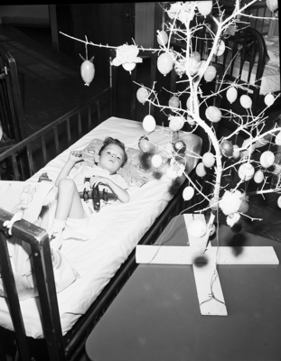 Danny Miller, 4, who was hit by a car March 23, takes time out from his toys to look over an Easter egg tree, a gift to City-County Hospital's pediatrics ward from Oak Knoll Elementary School. The boy is the son of Mr. and Mrs. Daniel Ray Miller of 515 Malta Street.