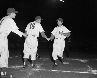Raymond Cuccharini comes home with the first of his two four-baggers, in the fifth. His second came in seventh. Offering congratulations is Bill Gabler, first baseman.