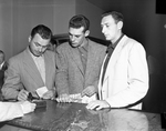 Relief Hurler Harry Dorish, Outfielder Bill Wilson and Pitcher Saul Rogovin, left to right, of the Chicago White Sox sign hotel register Thursday morning before exhibition games with the Cats at 8 p. m. Thursday and 2:30 p. m. Friday.
