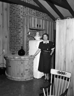 Fort Worth. City of. Residences. Mrs. Edgar Luhn shown in her combination, kitchen, dining room and den in her home at 4762 West Creek Drive.