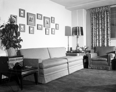 Ideal For Small Quarters - Three of the tables in the apartment of Jack McWhirter in Westchester House are pictured here. The corner table serves as a lamp stand, a magazine rack and a place for ashtrays. The step tables hold books and can be used for lamps, radio or pot plants.