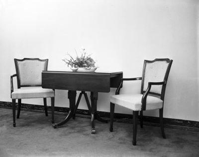 Slick Trick - A turn of the knob on the panel support of this drop-leaf table converts it from dining table height to cocktail tray convenience. This is one of the four tables used in the apartment of Jack McWhirter. The chairs are adaptable, too. They are dining room chairs and living room chairs as the occasion demands.