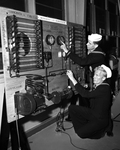 In Fort Worth's United States Naval-Marine Corps Reserve training center, reservists busy themselves acquiring naval know-how. A. P. McFarland explains the workings of a demonstrator refrigeration unit to C. E. Morton.