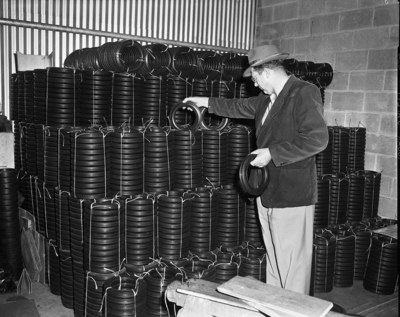 A New York lawn mower firm purchase 250,000 mower tires each year from Oil States Rubber Company in Arlington. The firm will have an exhibit Friday and Saturday in the annual Industrial Show at Arlington State College. Shown with tires is H. E. Bowerman, president of the firm. A partner is G. C. Waldrop.
