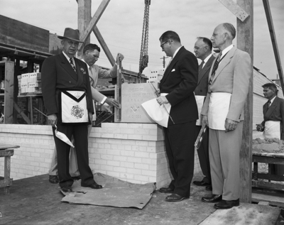 Participants in the laying of the cornerstone for Polytechnic Masonic Lodge's new hall Saturday included, left to right, G. R. M. Montgomery, who presided as representative of the grand master of the Grand Lodge of Texas, and Earl Bodiford, John G. Kemmerar, R. R. Howerton and Clyde Marshall.