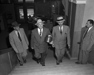 Chief And Evidence - Police Chief R. R. Howerton, left, arrived at Criminal Courts Building Tuesday afternoon with a jug which probably will show up again in the armed robbery trial of Gene Paul Norris. The jug, dug up in a clearing near Azle, contained $128,000 of the robbery loot, some of which is to be introduced as evidence. Walking up the stairs to the district attorney's office with Howerton is Chief of Detectives Cato Hightower.
