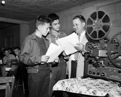 Getting Instruction - Junior Baseball Managers Jerry Bob Morris, left, of Handley and Jesse Andrade of the Fort Worth Kittens confer with Director Glen Wilcox concerning plans for the 1953 recreation department junior baseball season which opens play May 9.