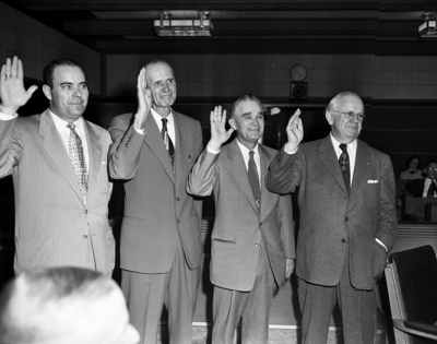 Councilmen Take Office - Swearing-in ceremonies for City Councilmen left to right, Thomas A. McCann, Jess F. Tarlton, M. M. McKnight and Edgar Deen, took place at City Hall Wednesday. Deen and McKnight are veterans on the council and Tarlton and McCann are newcomers. Five other councilmen will be selected in a runoff election April 21.
