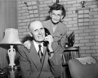 Council Winner - J. F. Tarlton, new Place 2 city councilman, accepts congratulations of a friend by telephone while his wife looks on.
