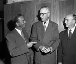 Schooling - Atwood McDonald, right, who began his first term on the board of education Wednesday, listens while Stuart Lydick, left, and O. C. Armstrong discuss school matters. The three were elected Saturday. Armstrong was chosen board president to replace George Conner, who did not run for the board again. Lydick will be serving his first elective term after being appointed to a vacancy. This is Armstrong's second six-year term.
