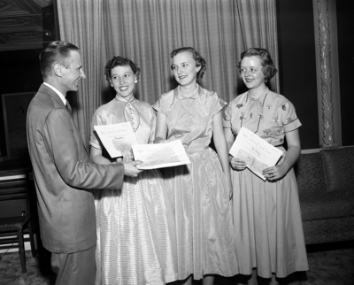 Awards Day - Hassell Edwards, chairman of the Advertising Club essay contest, presents a check and certificate to Rosemary Weipert, center, who won first place in the competition. Other winners are Shirley White, left, second place, and Sue Smiley, third. The awards were made Wednesday during a luncheon in Hilton Hotel.