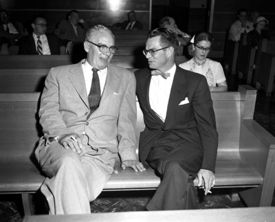 Just Plain Spectators - Ray Crowder, left, and Robert B. McKinley sit on a spectators' bench in city council chamber after they retired from council seats Wednesday. Neither man ran for re-election.