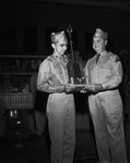 Receiving permanent possession of the O. D. Wyatt Jr. Memorial Trophy for the best-drilled platoon among Fort Worth high school ROTC units is Cadit Lt. Charles I. Powell, left, of Paschal. Handing him the award is Lt. Col. James E. Warren, commanding officer of the 145th Armored Infantry Battalion, Texas National Guard.