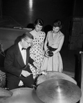 Opening Performance - First night presentation of the two operas, "Cavalleria Rusticana" and "Gianni Schicchi" at Will Rogers Memorial Auditorium was exciting to the audience as well as the performers. Misses Jerry Ann Barney and Mary Ann Brown, left to right, who sang behind the curtain in the church scene for "Cavalleria Rusticana", listen as Philip Hewett, percussionist, practices before the performance.