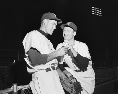 Al Ronning, left, catcher, and Bill Glane, pitcher talk about their play.