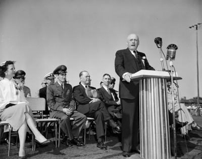 McKinney's Baker Day - He listens to Representative Sam Rayburn of Bonham, the day's principal speaker, in company with McKinney Mayor Fitzhugh Newsome, left, and A. H. Eubanks, Baker Day master of ceremonies.