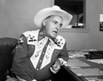 Ken Maynard is wearing a cowboy costume. He made his first motion picture in 1923 and estimated that in his career he appeared in hundred of films. He has been doing some television work since 1951.