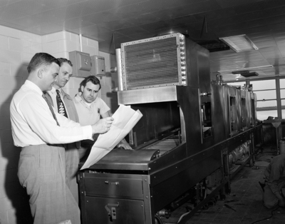 Soap Suds Streamliner - A trio examines the blueprints of Greater-Fort Worth International Airport's $15,000 dishwasher, now being assembled. They are, left to right, Dave White of Dallas and William Epperson of Troy, Ohio, Hobart Manufacturing Company representatives and Charles Dewland of New York City, assistant to the purchasing director of Sky Chefs.