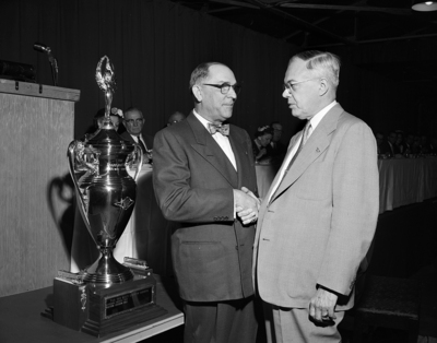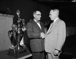 For The Record - W. G. Vollmer, right, president of Texas & Pacific Railway Company, congratulates Eastern Division Superintendent W. T. Alexander of Fort Worth during the Friday night presentation of the Vollmer Safety Trophy to the division.