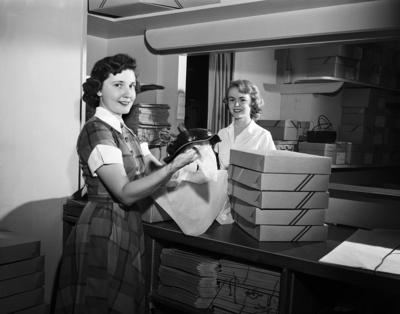 Trip Talk - Shirley Windsor, left, Paschal High School student working in Monnig's millinery department, discusses her job with Nancy Jones of North Side, in training at Leonard's Department Store. The girls will attend the sixth annual convention of Distributive Education Clubs of America in Dayton, Ohio. Both take distributive education in high school.