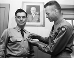 Decorated - Major Borden Wright, right, pins Bronze Star on Master Sergeant Gus Hinson. The major is U. S. Army Reserve instructor here. Hinson is his assistant.