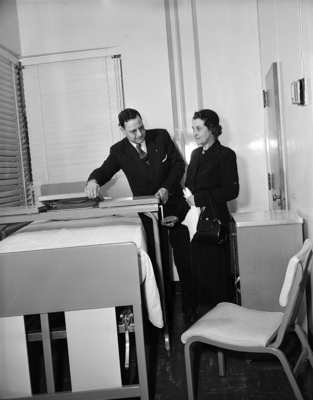 From Graduates - Lowell Hudson, City-County Hospital administrator, inspects furniture given the hospital by members of the School of Nursing Alumnae Association. Mrs. R. G. Baker, immediate past president, presented the equipment from the groups Saturday.