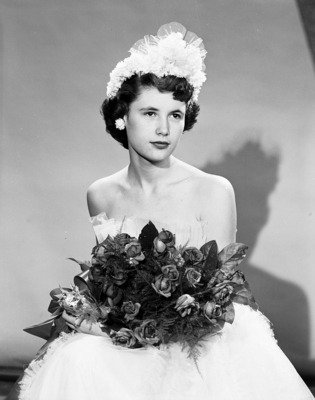 Charlene Williamson is wearing a formal dress and holding a bouquet of flowers. She is the daughter of Mr. and Mrs. Ted Williamson.