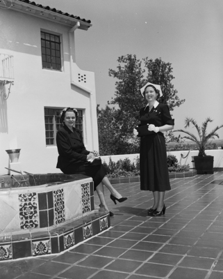 Mmes. Charles F. A. McCluer, left, and R. C. Newkirk in the patio of the Kay Kimbell home, 21 Westover Road, which opened to Fort Worth Garden Club members.
