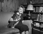 A Manx and Friend: Mrs. R. B. Dunbar, 3717 Clarke, is pictured with her haughty Manx cat, left; and its inky companion, right, which is "pure Texan".