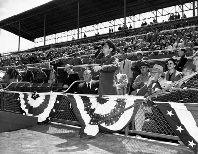 Game's On - Colonel Royal N. Baker, U. S. jet ace from McKinney, throw out the ball from a box at La Grave Field to open first 1953 Texas League game here Sunday. Tulsa Oilers beat the Cats, 6-3.
