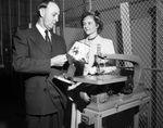 Finished Product - Superintendent C. F. Brewer of White Settlement shows Mrs. Robert L. Long of 409 Sands Ct. some of the work done by students in woodworking classes. Mrs. Long was one of the estimated 2000 visitors during open house Sunday at C. F. Brewer High School.