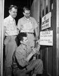 Blood Priority - Giving blood will have priority over business Tuesday at United Machine Company when its tooling department will close so employees can help out in Lions Club blood bank campaign. Toolmaker Harold Rattan gets sign ready while Production Foreman John Hadsell, left, and Tooling Supervisor Ralph W. Cheek look on.