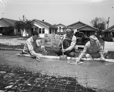 The concrete floor base of a "Goodwill House" at 915 Broadus for Mrs. Ruth Vorhies is smoothed by A. C. Lampman, left, and T. C. Molloy, right, members of the Plasterers and Cement Finishers Local 34, and A. H. Bing, Precinct 1 employee.